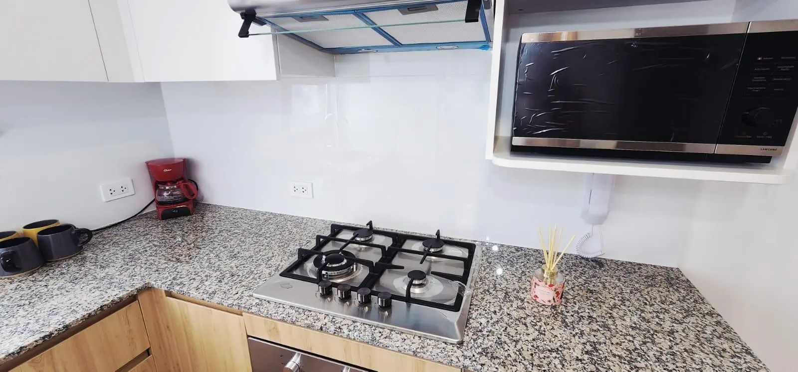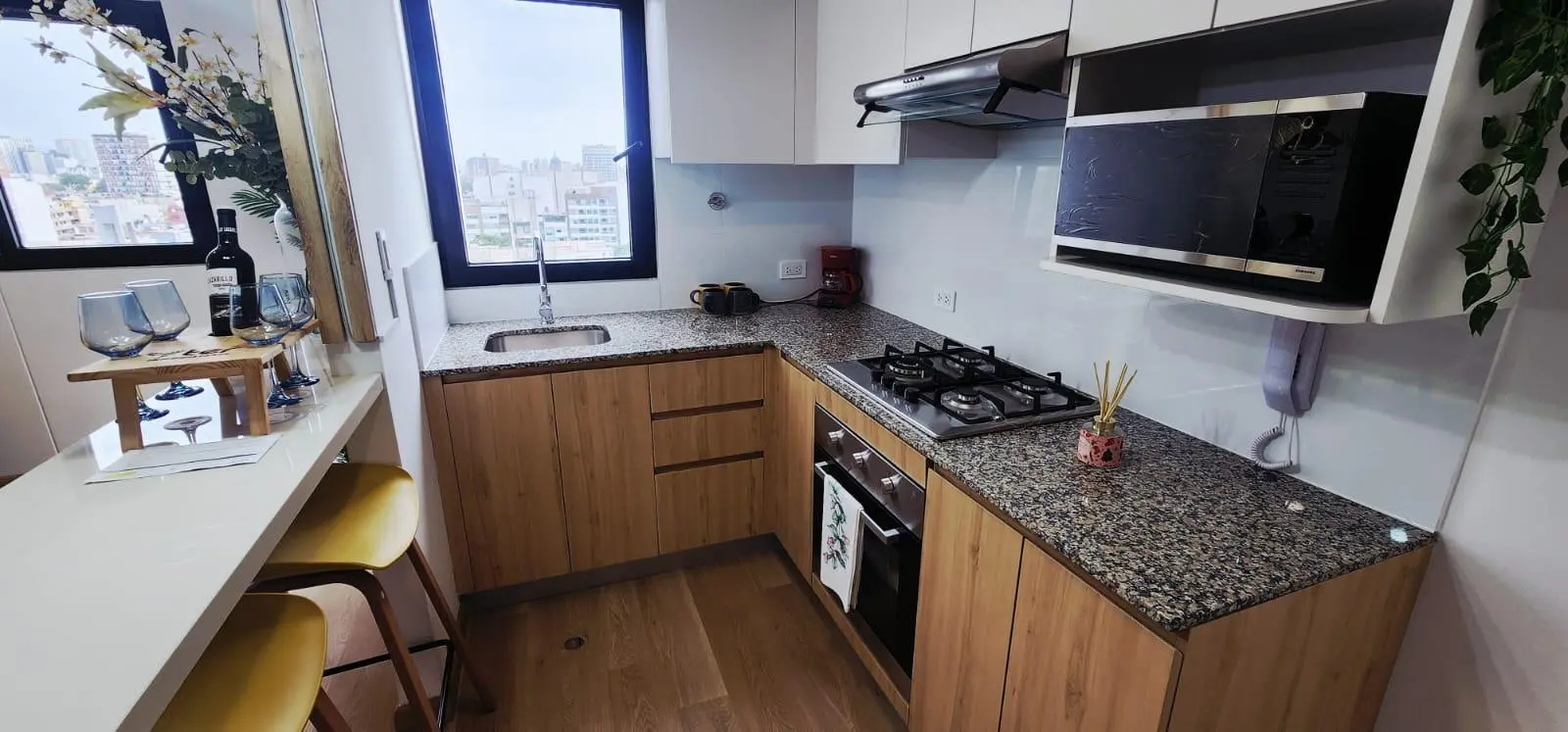 Cocina estilo americano, equipada con muebles altos y bajos en melamina.