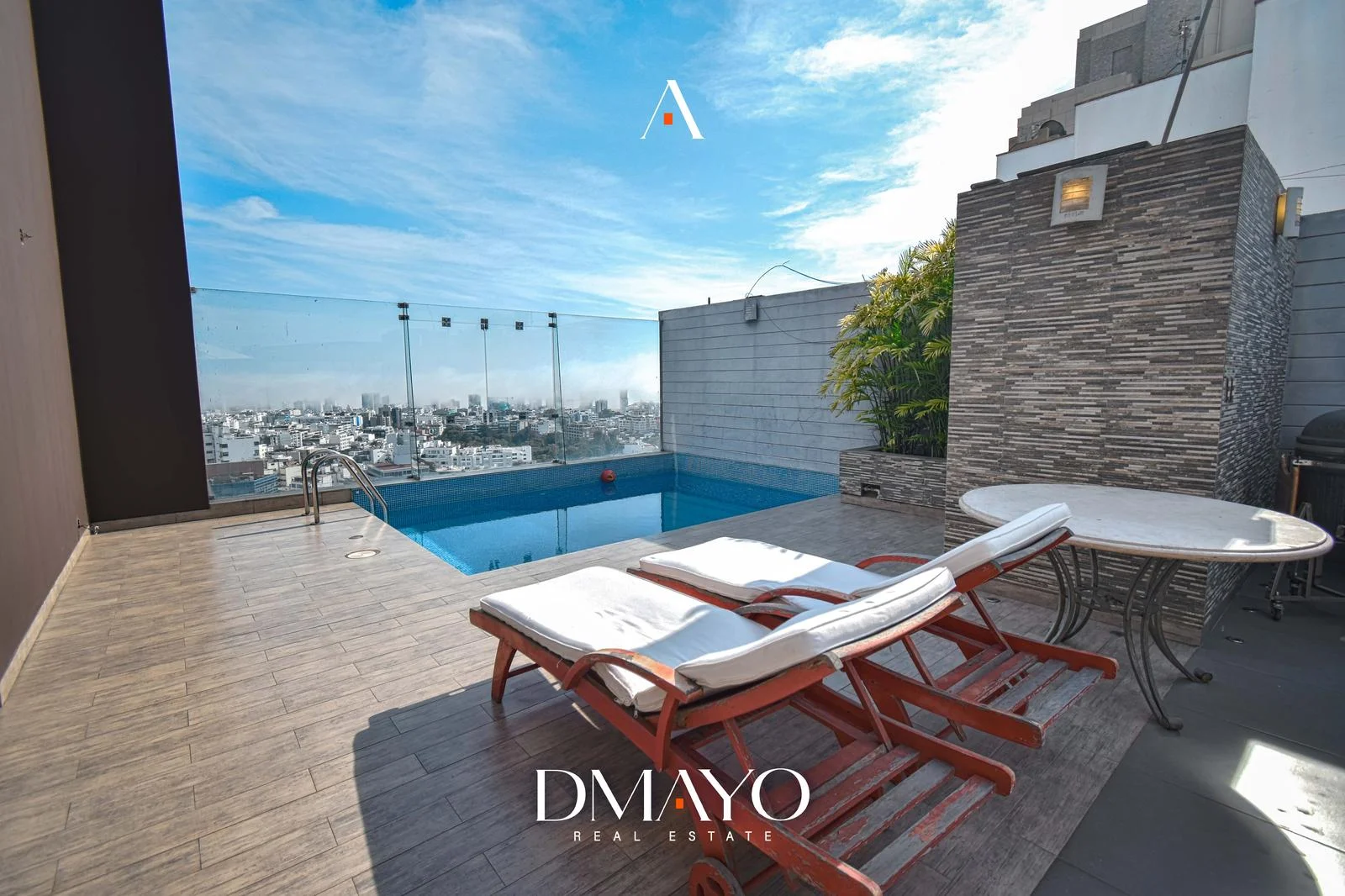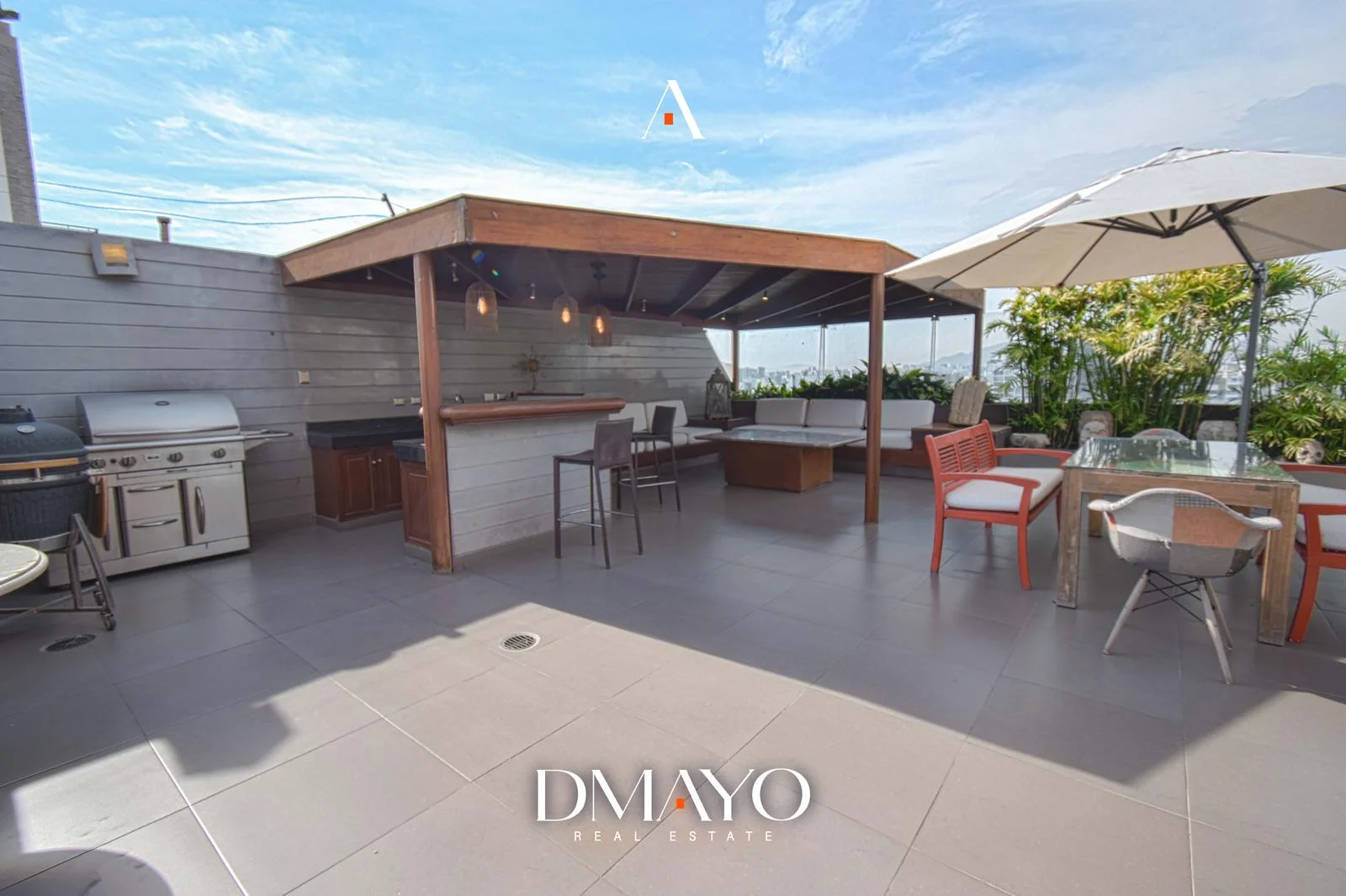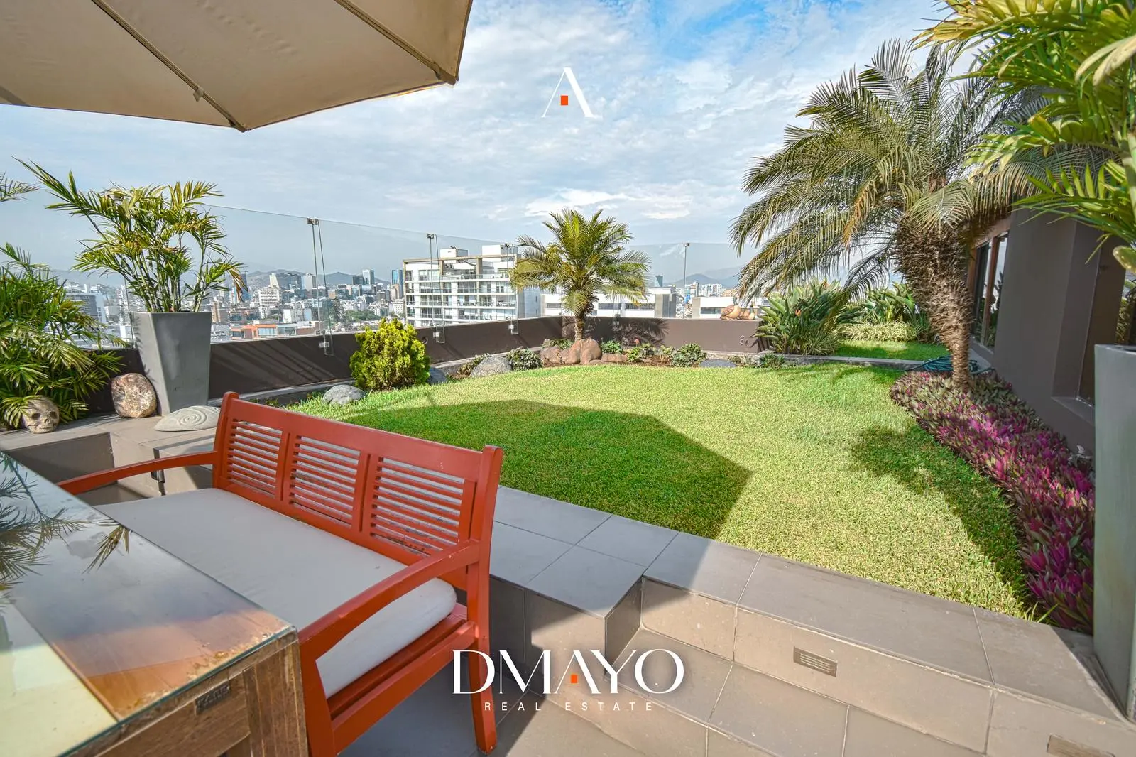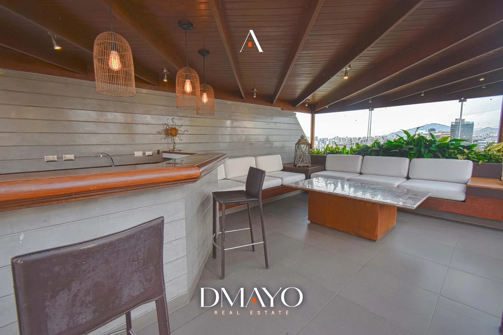 En el último nivel se encuentra la zona social: una amplia terraza con jardín y piscina al aire libre, desde donde se puede ver la ciudad y el mar. Además, el departamento incluye sala de cine y bar, ideales para disfrutar y recibir invitados.