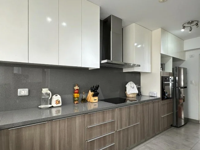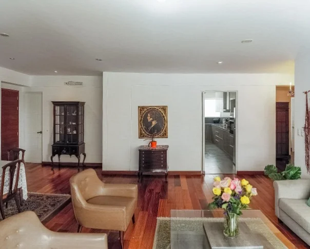 Sala- Comedor con baño de visita, cocina amoblada y equipada con area de servicio completa ( lavanderia, cuarto y baño de servicio). El departamento cuenta con una sala de estar, 3 dormitorios, el principal con walkincloset y baño incorporado los otros dos dormitorios con closet empotrados comparten un baño completo.