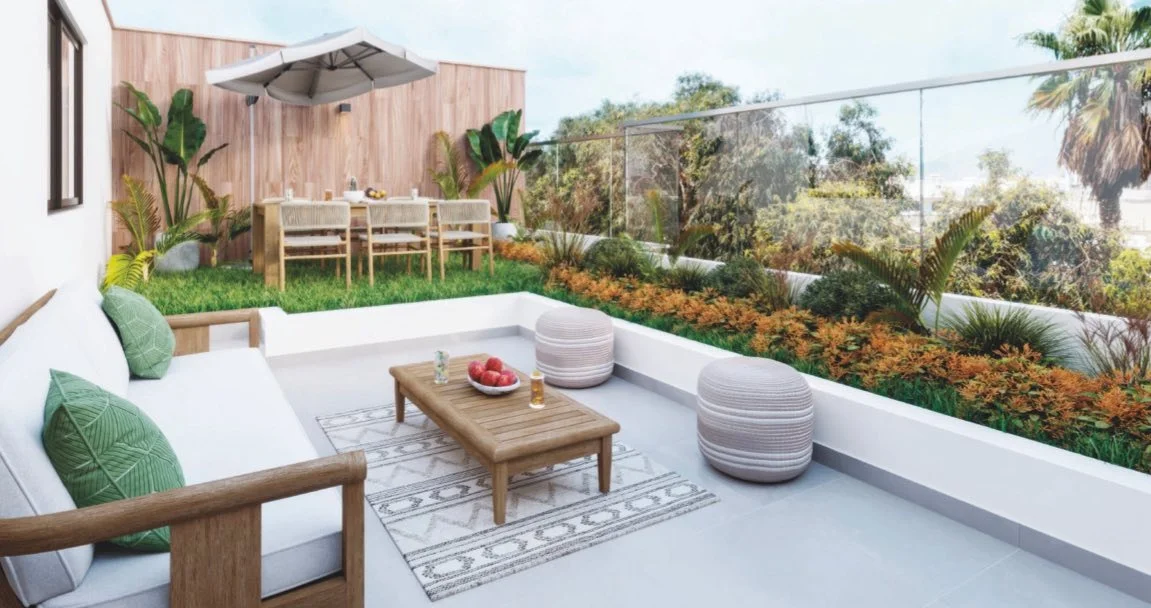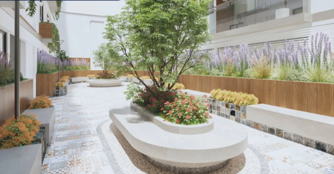 • Departamentos con vista interior hacia un acogedor patio central con árboles y plantas
