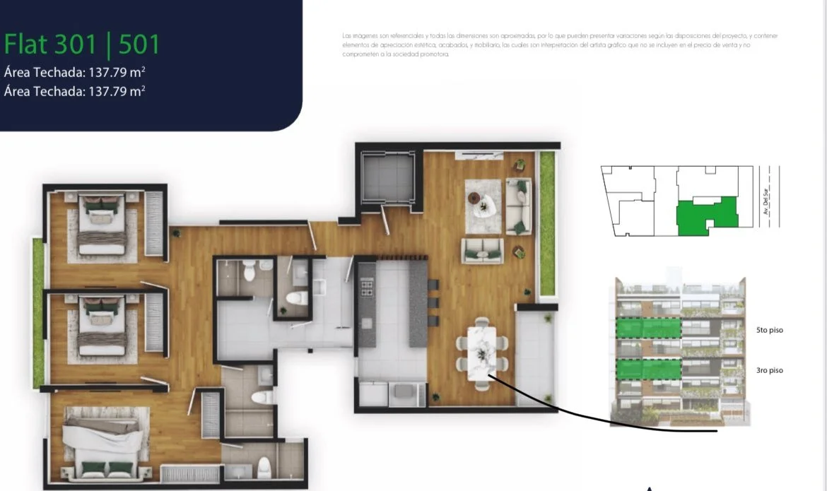 • Pisos de bambú en sala, comedor y dormitorios, aportando calidez y elegancia