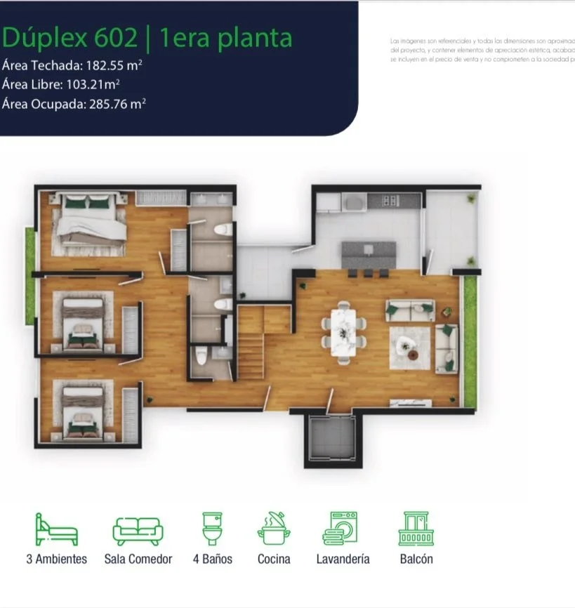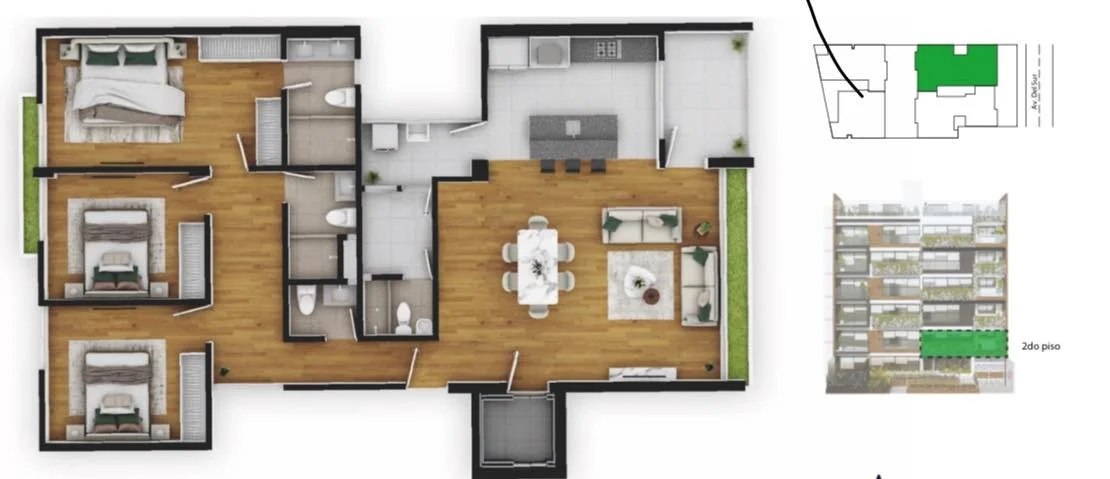 Departamentos de 3 dormitorios, 2 baños completos, baño de visitas, cocina americana
