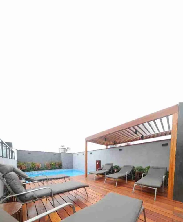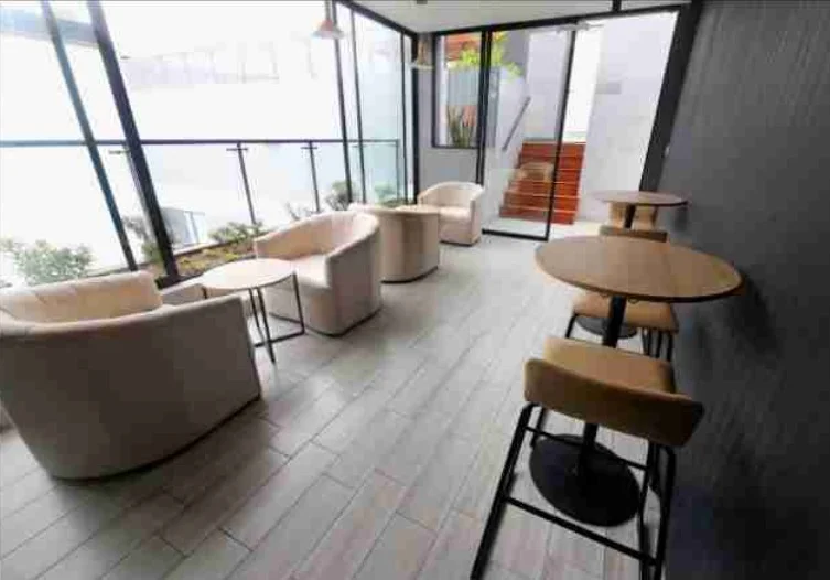 Áreas comunes: Piscina, Área de BBQ, Salón de Bar, Coffee Room, Jardín Zen. Recepción, Vigilancia, Limpieza A1.