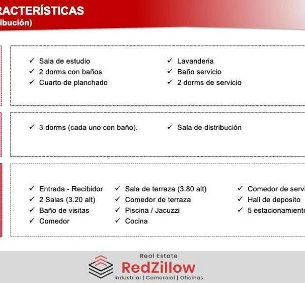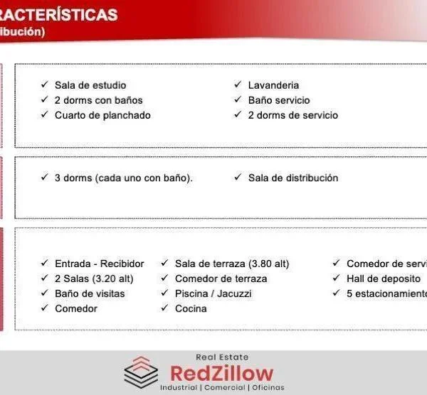 TIPO Casa de lujo con pisos distribuidos en m de edificacin con cercana a zona comercial y empresarial UBICACIN Av Los Pinos San Isidro CARACTERSTICAS rea Terreno m rea Construda m PISO Entrada Recibidor Salas alt Bao de visitas Comedor Sala de terraza alt Comedor de terraza Piscina Jacuzzi Cocina Comedor de servicio Hall de deposito estacionamientos PISO dorms cada uno con bao Sala de distribucin PISO Sala de estudio dorms con baos Cuarto de planchado Lavanderia Bao servicio dorms de servicio CONTACTAR Celular WhatsApp Somos RedZillow especialistas en servicios corporativos abarcando desde la representacin de propietarios y arrendatarios hasta el financiamiento de capital a largo plazo Nuestra meta es ayudarte a fortalecer y enriquecer la inversin en tu negocio ocupndonos de soportar tus decisiones inmobiliarias sobre espacios de oficinas almacenes retail terrenos y plantas industriales Somos RedZillow especialistas en servicios corporativos abarcando desde la representacin de propietarios y arrendatarios hasta el financiamiento de capital a largo plazo Nuestra meta es ayudarte a fortalecer y enriquecer la inversin en tu negocio ocupndonos de soportar tus decisiones inmobiliarias sobre espacios de oficinas almacenes retail terrenos y plantas industriales