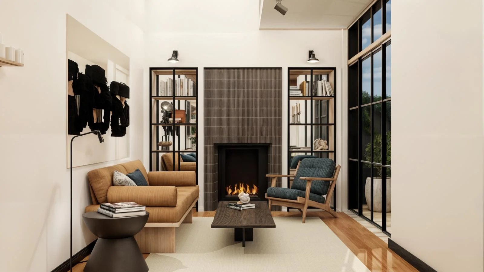 • Sala amplia con vista a jardín pequeño y chimenea