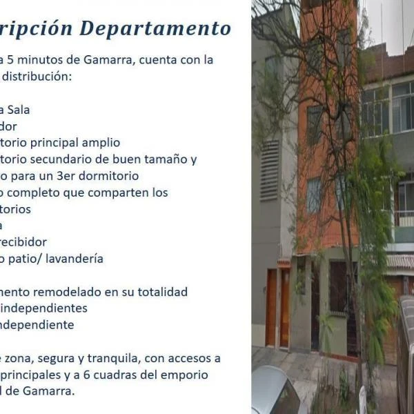 En er piso de metros cuadrados ubicado a minutos de Gamarra cuenta con la siguiente distribucin Amplia Sala Comedor Dormitorio principal amplio Dormitorio secundario de buen tamao y espacio para un er dormitorio bao completo que comparten los dormitorios Cocina Patio recibidor Amplio patio lavandera Departamento remodelado en su totalidad Servicios independientes Ingreso independiente Excelente zona segura y tranquila con accesos a avenidas principales y a cuadras del emporio comercial de Gamarra
