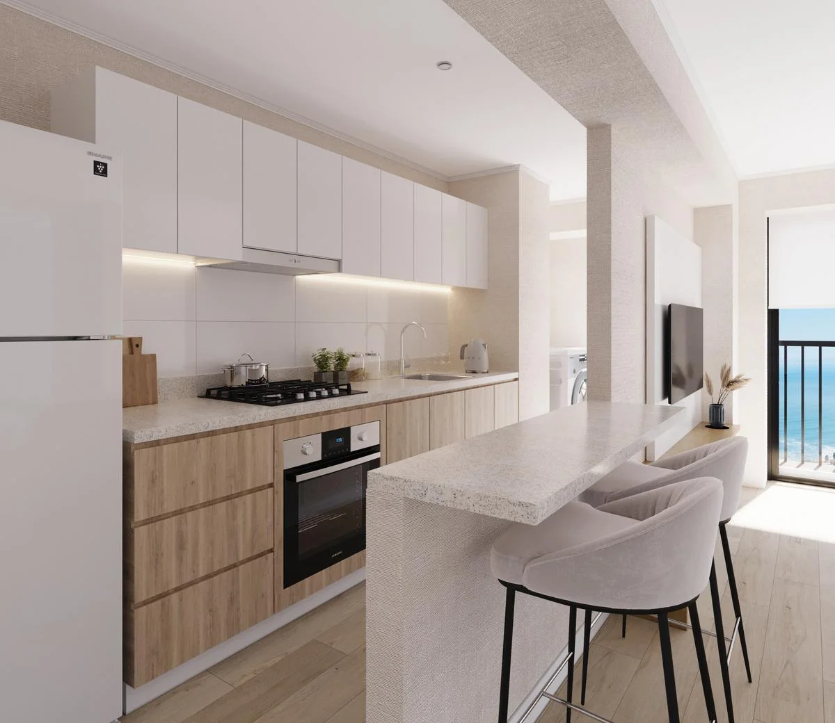 El Departamento ofrece una distribución moderna y funcional que optimiza cada uno de sus espacios, pensado para proporcionar comodidad y estilo de vida. Al ingresar, te recibe una acogedora sala, ideal para relajarse o recibir visitas, que se integra de manera armoniosa con un balcón, permitiendo la entrada de luz natural y ofreciendo un rincón perfecto para disfrutar de un café al aire libre o simplemente contemplar el entorno.
