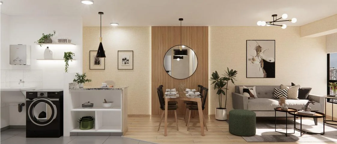 Este acogedor departamento ha sido diseñado para quienes buscan funcionalidad y comodidad en un mismo espacio. Al ingresar, se encuentra una amplia área social que integra la sala y el comedor en un solo ambiente abierto, ideal para compartir momentos en familia o con invitados. Este espacio se conecta de manera fluida con un moderno kitchenette, equipado para facilitar las tareas diarias de cocina sin perder el contacto con las demás áreas, lo que lo convierte en el corazón del hogar.