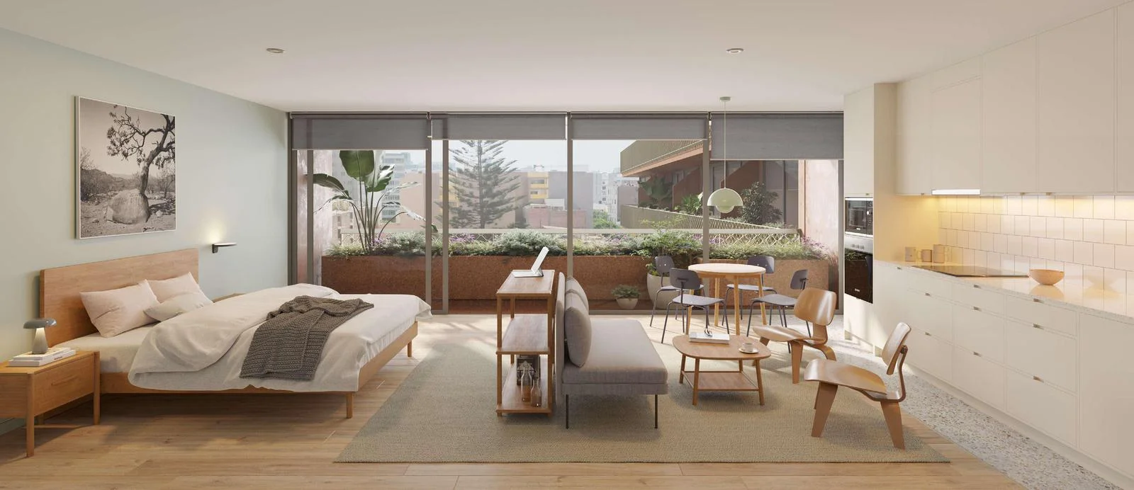 Sala-comedor, cocina, 1 dormitorio, 1 baño completo, 1 baño de visita, zona de lavado. Terraza, sala de estar.