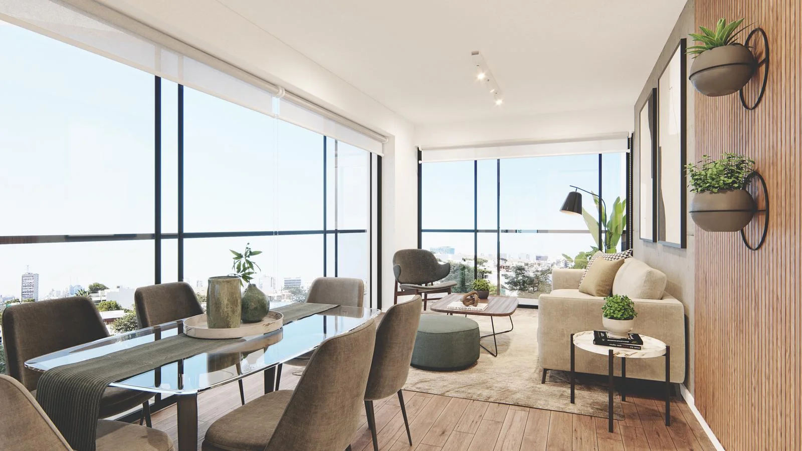 Cada uno de estos refinados hogares ha sido meticulosamente diseñado para ofrecer el máximo confort y estilo. Al entrar, uno es recibido por una amplia sala-comedor, diseñada para la comodidad y la convivencia. Desde aquí, se accede a un encantador balcón, que invita a disfrutar de la vista y del aire fresco de la ciudad.