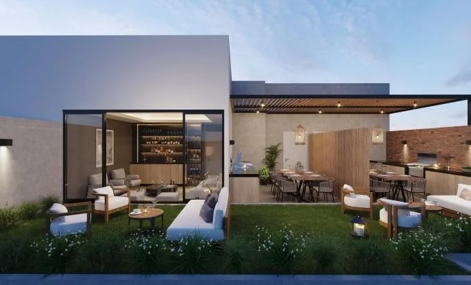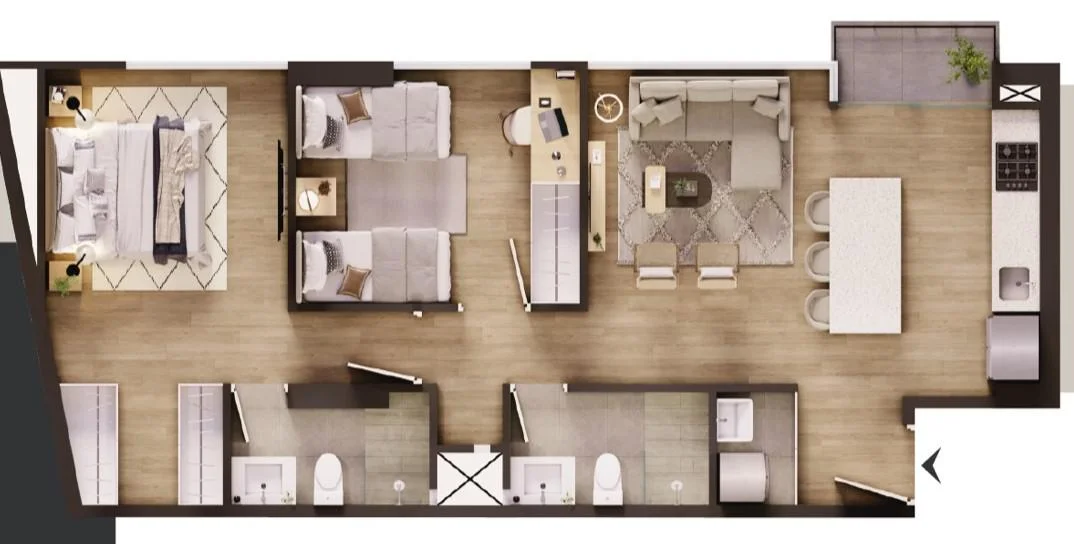 En cuanto a las habitaciones, cada departamento dispone de dos dormitorios amplios y luminosos. El dormitorio principal ofrece un refugio tranquilo para descansar, con espacio suficiente para una cama grande y mobiliario adicional, mientras que el segundo dormitorio es ideal para huéspedes, niños o incluso como oficina en casa. Los dos baños completos están elegantemente decorados y equipados con modernos accesorios y acabados, proporcionando un ambiente relajante para el aseo diario.