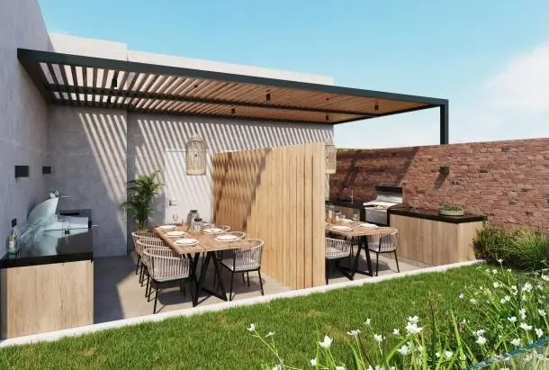 La cocina, o kitchenette, está equipada con todas las comodidades modernas necesarias para preparar comidas deliciosas. Su diseño abierto permite una fácil interacción con el comedor y la sala, haciendo que el acto de cocinar sea una experiencia social y agradable. Este espacio está pensado para maximizar la eficiencia y la comodidad, con acabados de alta calidad que satisfacen las necesidades de los residentes más exigentes.