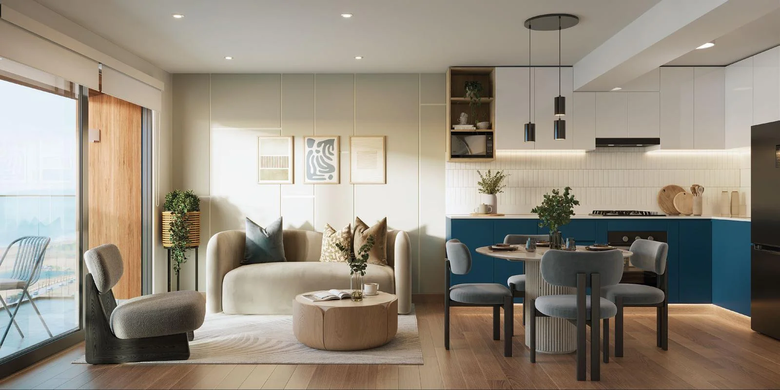Cuenta sala-comedor, kitchenette, 2 dormitorios, 2 baños completos, lavandería, balcón con vista al mar.