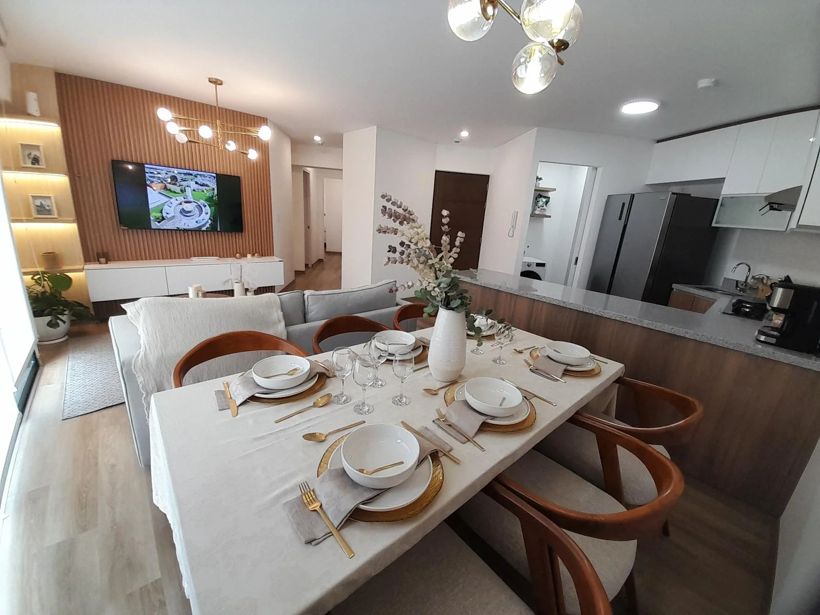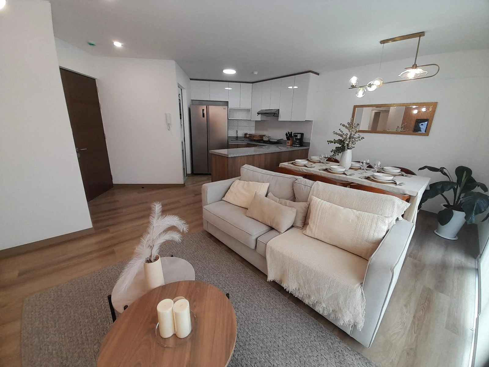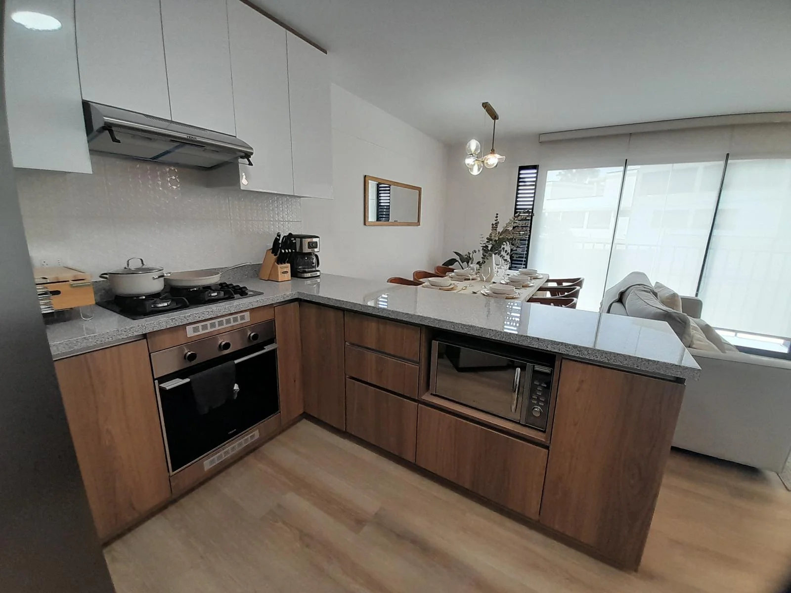 Al ingresar, te recibe una acogedora sala y comedor, diseñados para brindar confort y elegancia. La cocina abierta cuenta con muebles altos y bajos, optimizando el almacenamiento y aportando un diseño funcional y sofisticado. Un balcón permite la entrada de luz natural y ventilación, creando un ambiente cálido y acogedor.