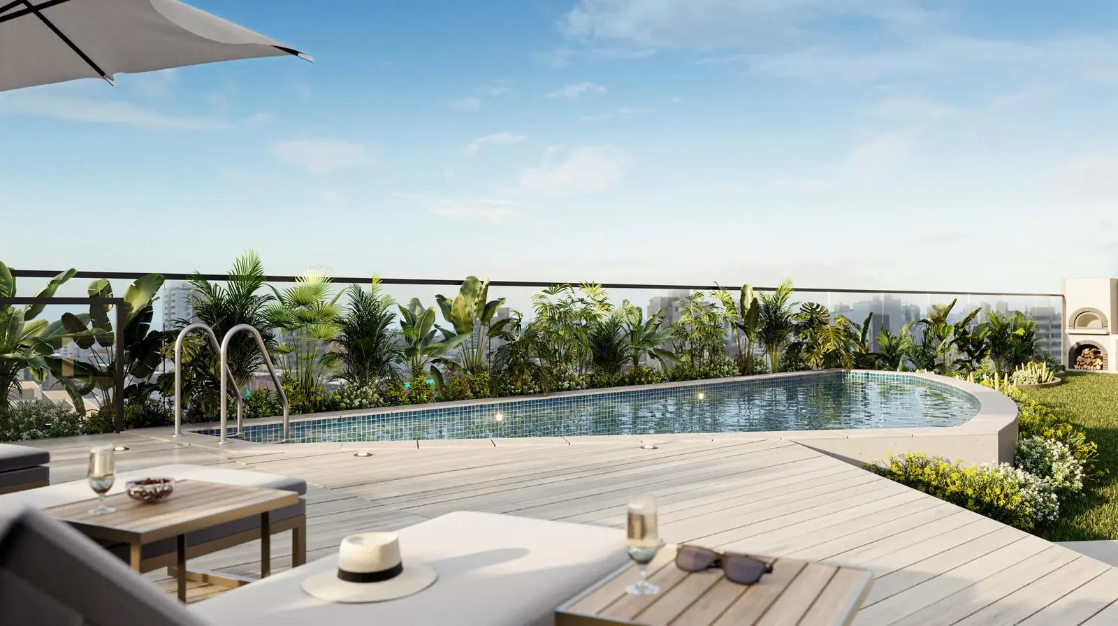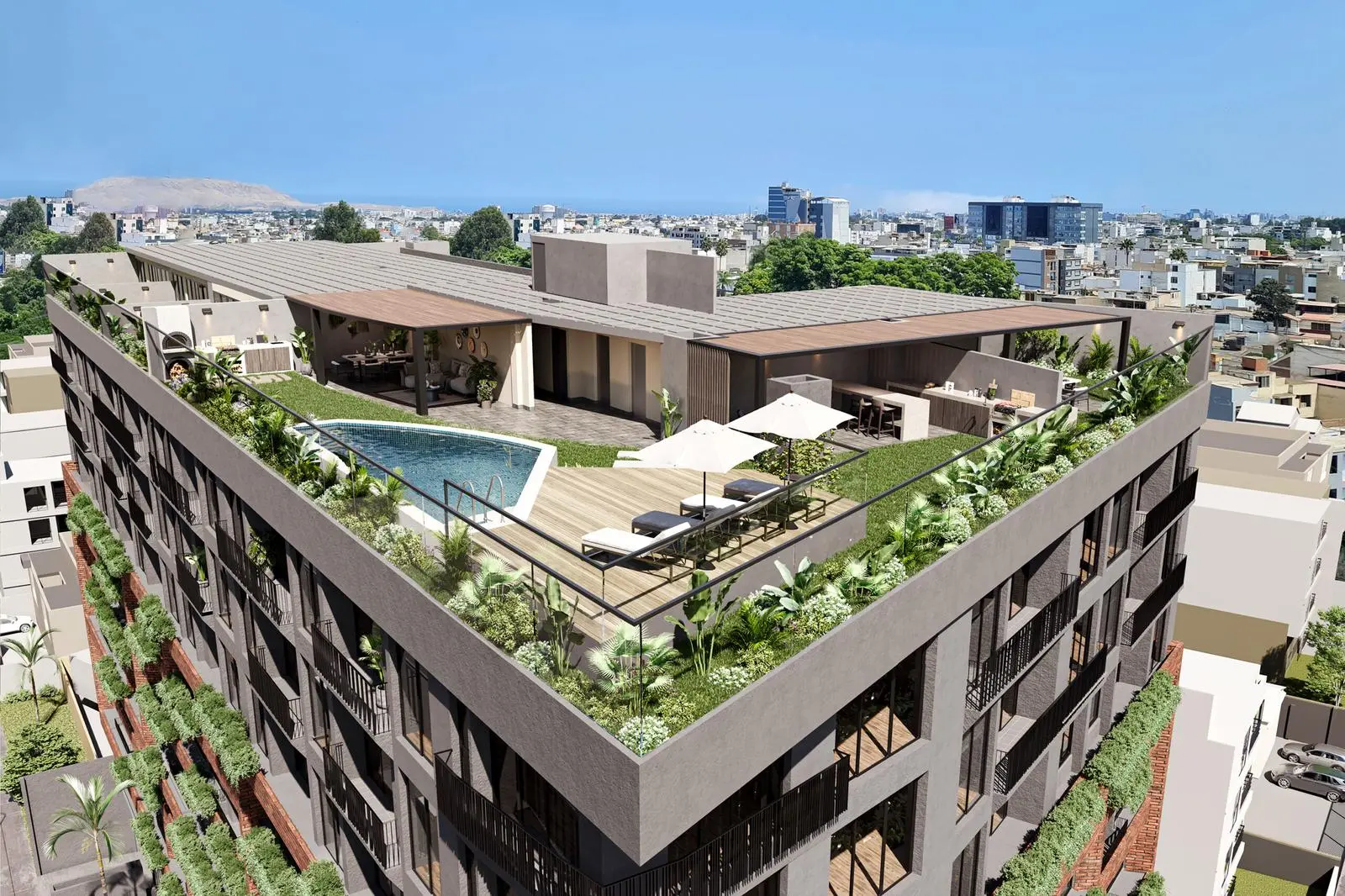 En la azotea, la terraza con jardín ofrece un ambiente relajante con vistas panorámicas. La piscina con deck es el lugar perfecto para disfrutar de un día soleado, mientras que el área de BBQ y el horno artesanal permiten crear experiencias gastronómicas memorables.