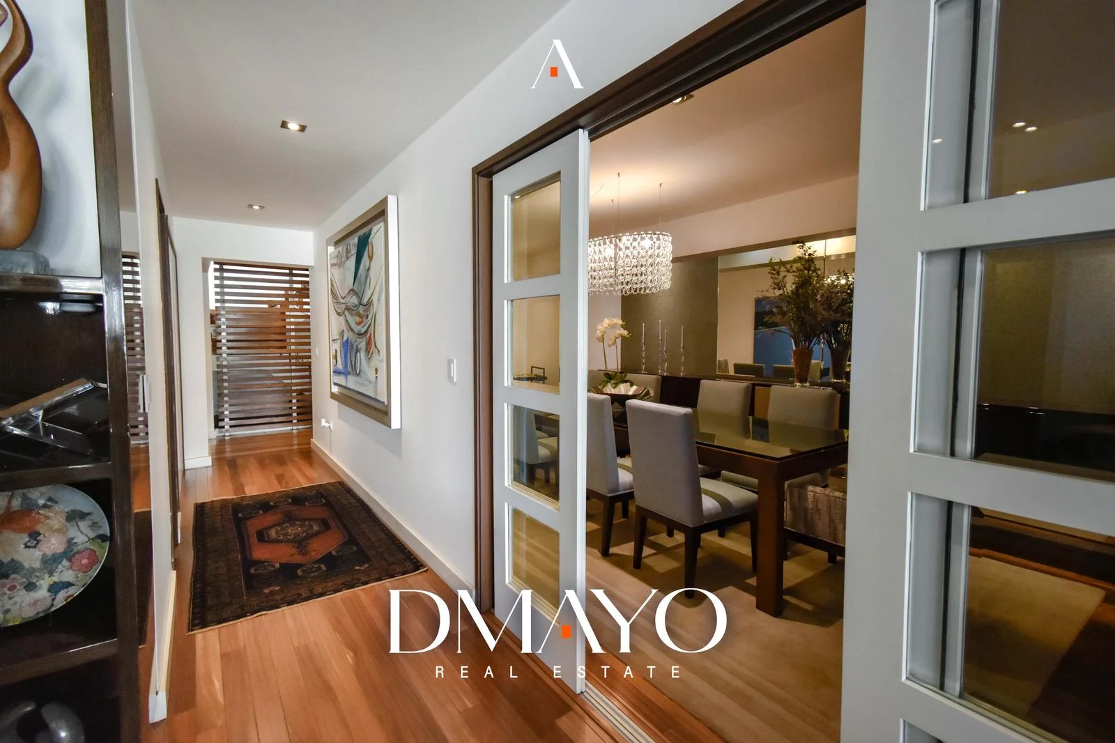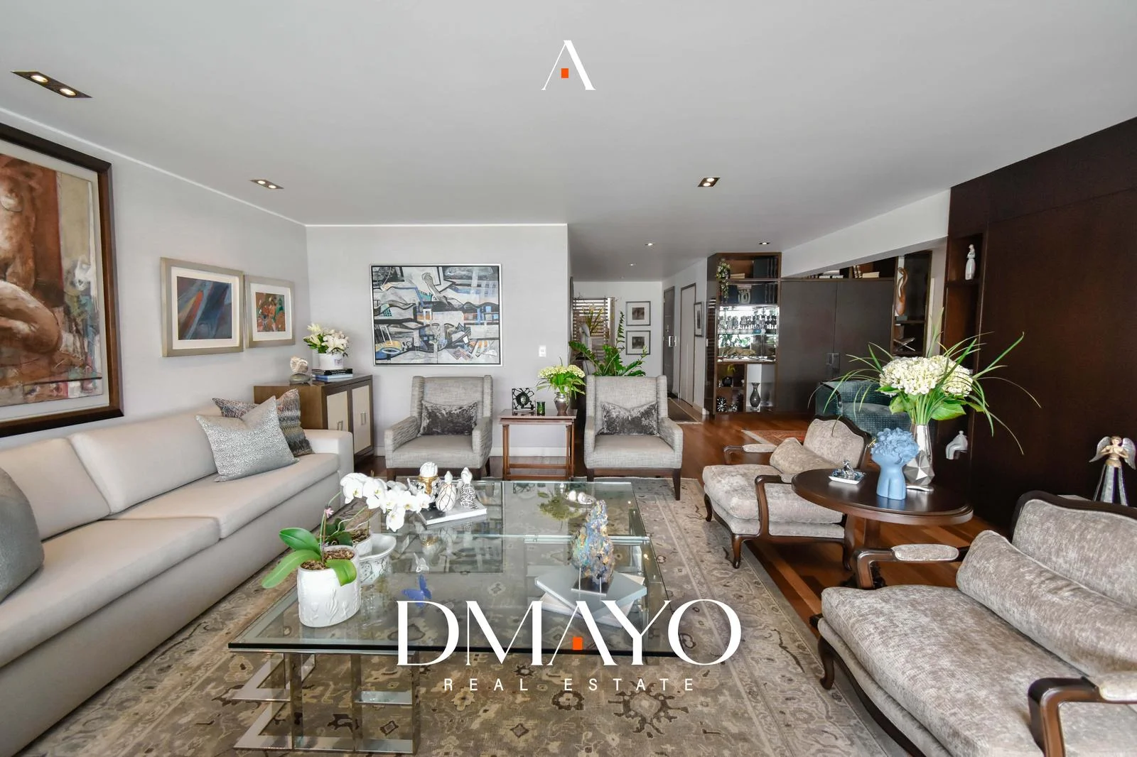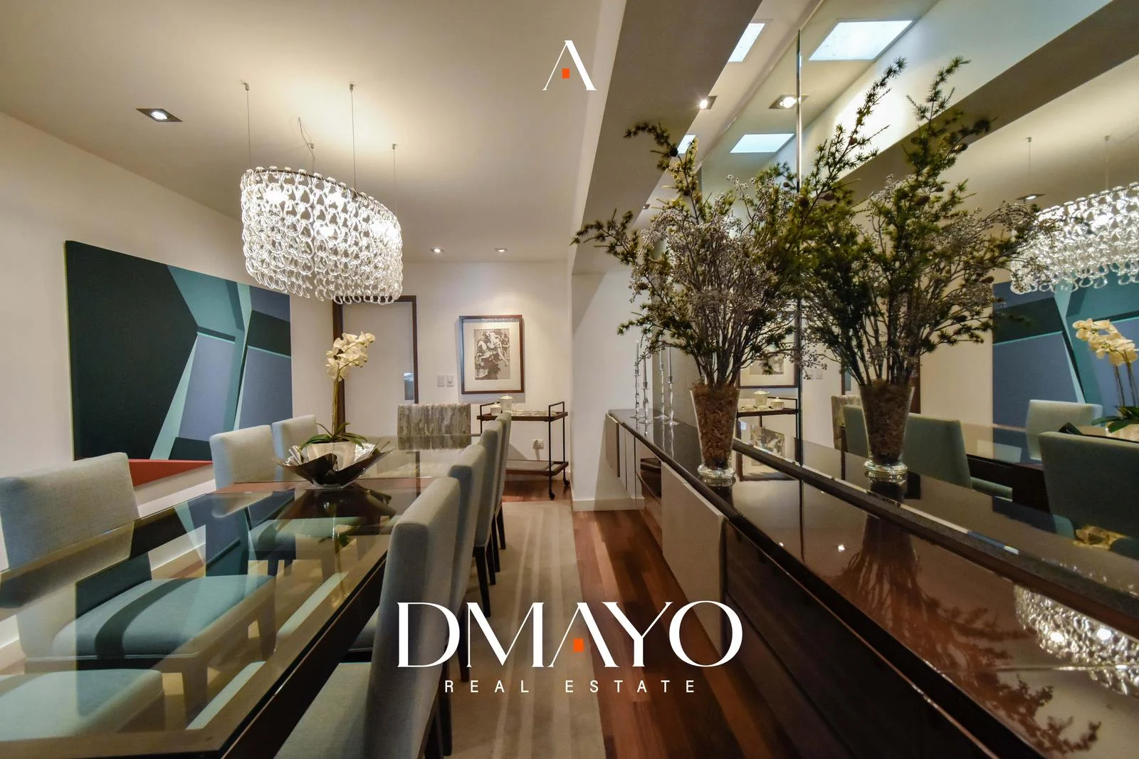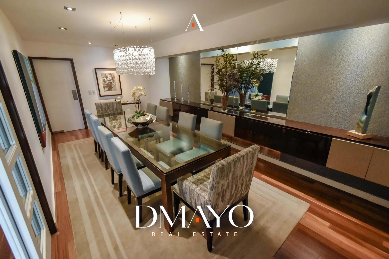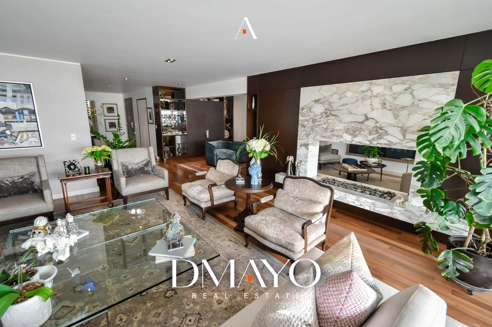 El departamento cuenta con ascensor directo, que da acceso a una elegante sala principal dividida en dos ambientes por una chimenea, creando espacios acogedores y sofisticados. Un comedor principal con capacidad para 16 personas y un bar.
