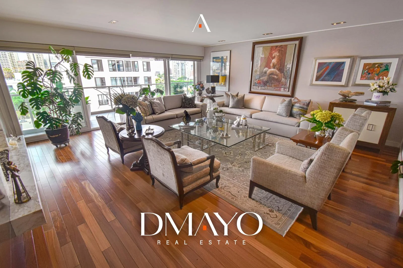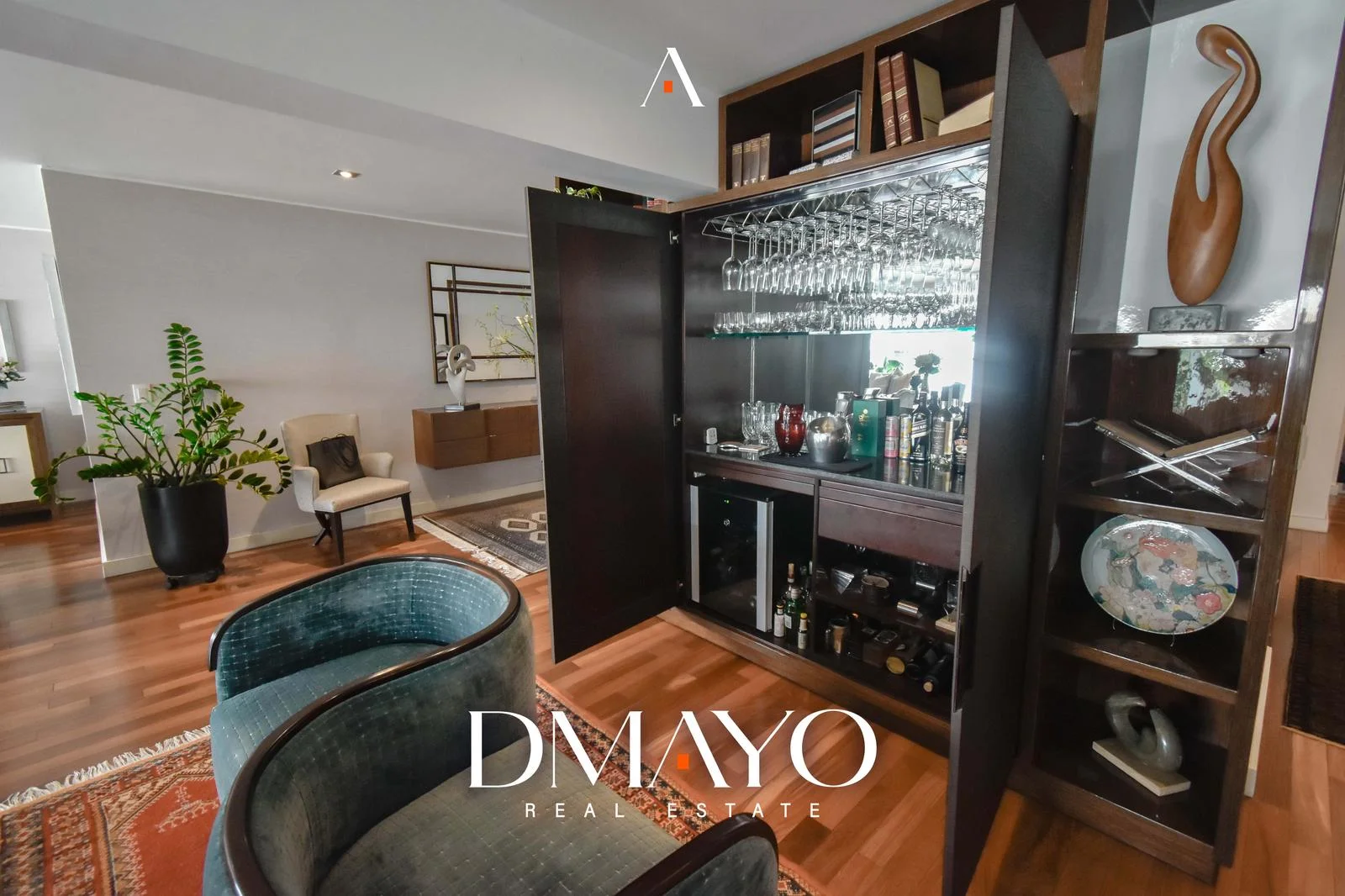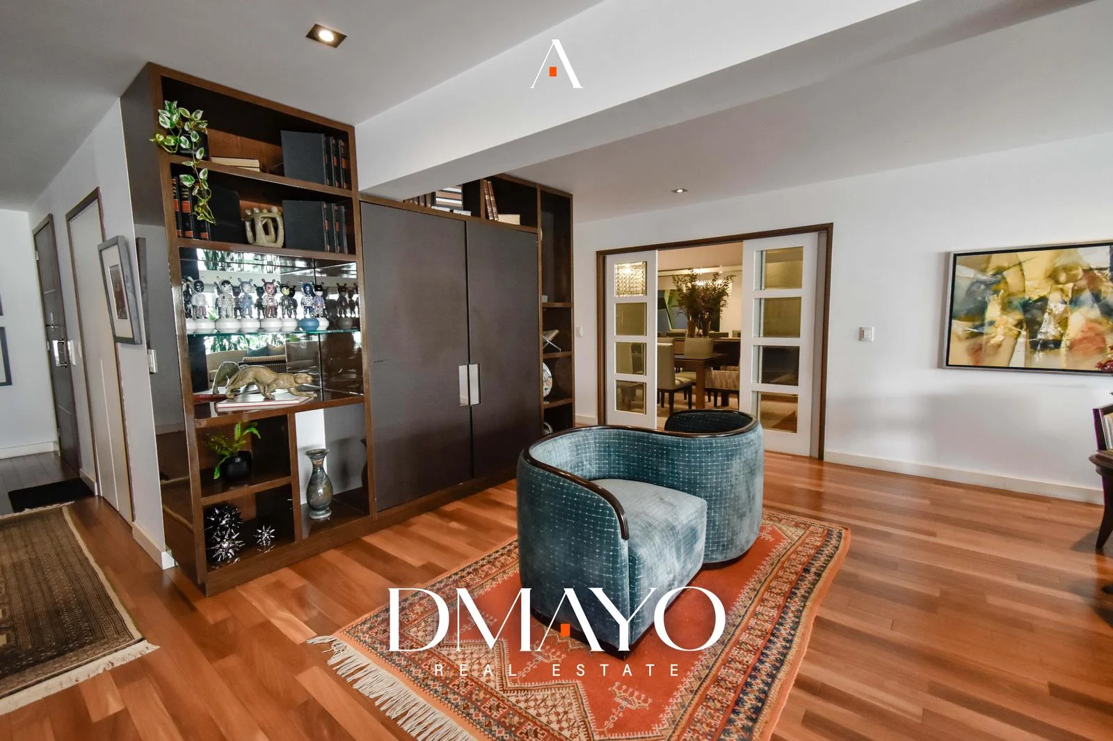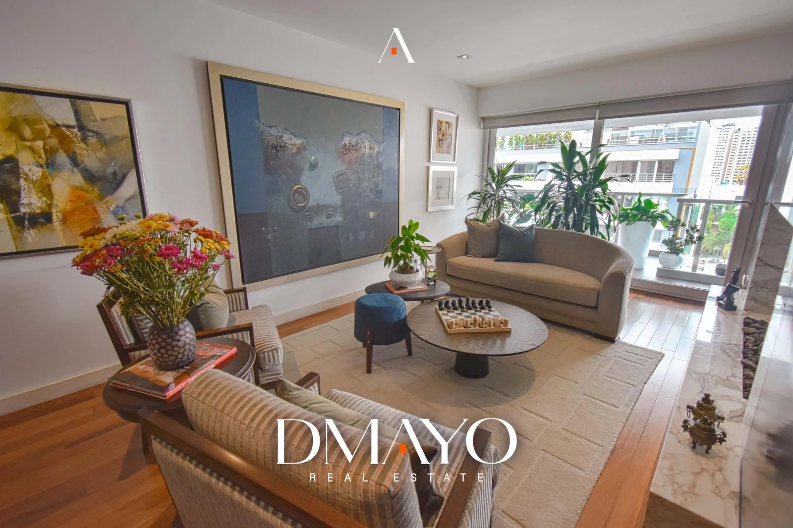 El departamento cuenta con ascensor directo, que da acceso a una elegante sala principal dividida en dos ambientes por una chimenea, creando espacios acogedores y sofisticados. Un comedor principal con capacidad para 16 personas y un bar.