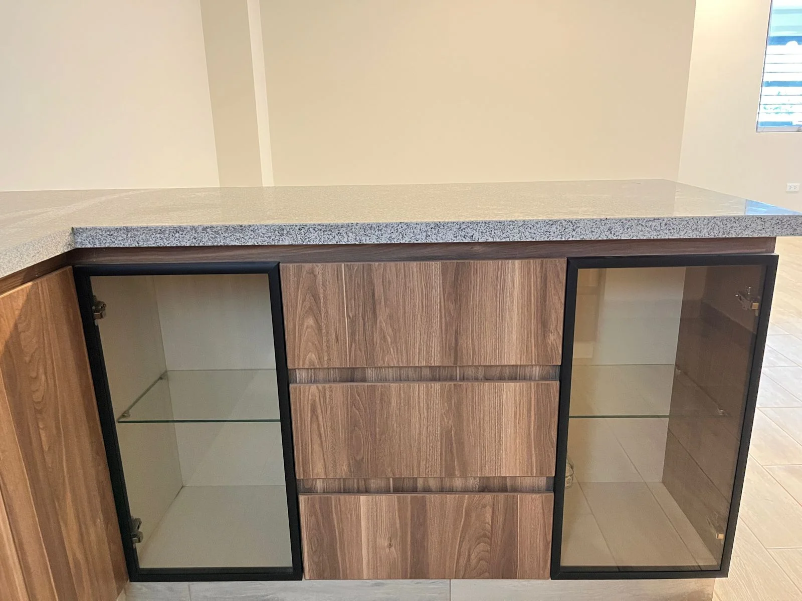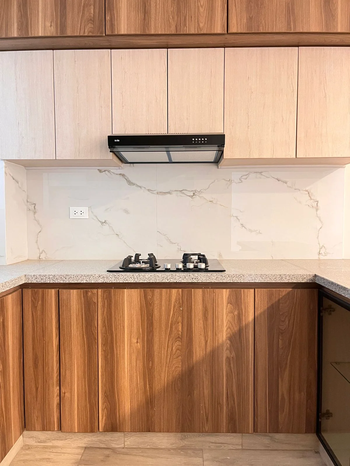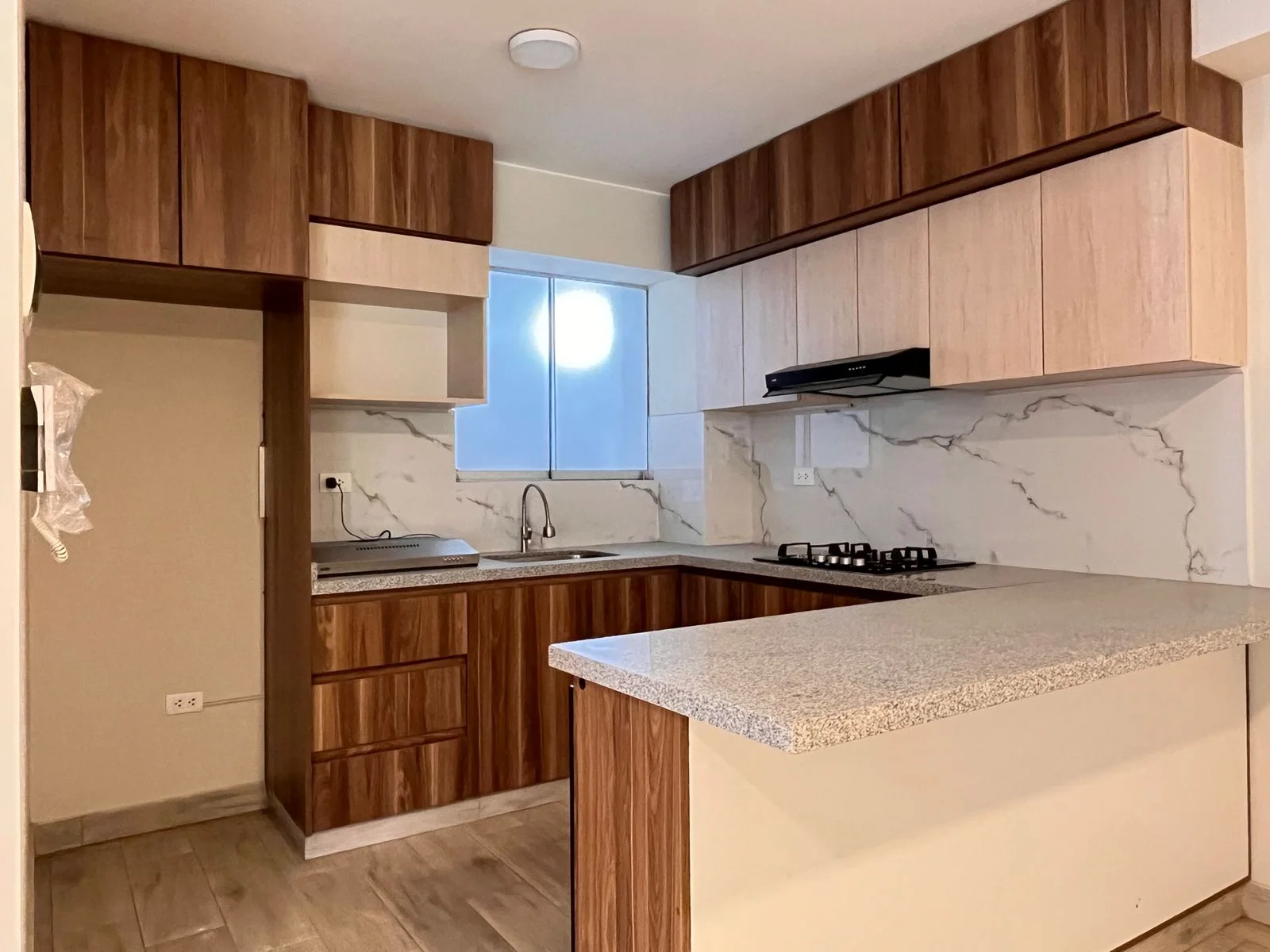 - Cocina americana con tablero de granito y reposteros altos/bajos. Equipada con encimera y campana extractora.